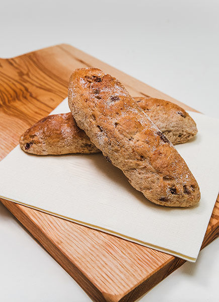 water, tarwe bloem (25%) (GLUTEN), tarwe meel (25%), rozijnen (10%), hazelnoten (5%) (HAZELNOTEN), gist, Uniplus, koolzaadolie, enzymen, meelverbeteraar E300, zout.
