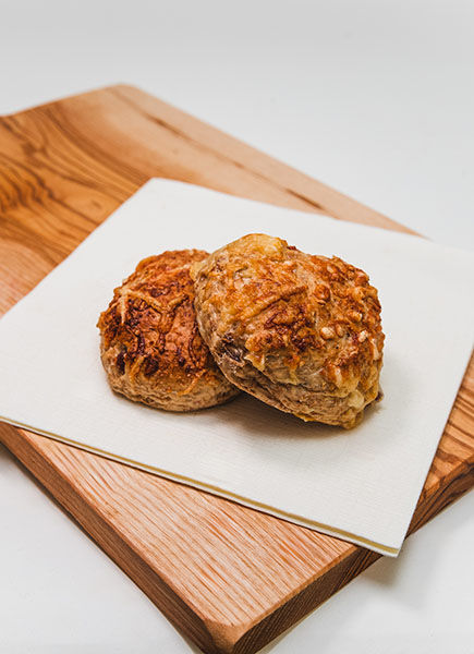 TARWEmeel (GLUTEN), water, spek (17%), ui (8%), suiker, gist, Uniplus, koolzaadolie, enzymen, meelverbeteraar E300), margarine (Plantaardige oliën en vetten (palm, koolzaad in wisselende verhoudingen), water, emulgatoren: lecithinen, E471, zout (1,0%), weipoeder (MELK), voedingszuur: citroenzuur, aroma's, kleurstof: caroteen, vitaminen (vitamine A,vitamine D).), zout.Voedingswaarde per 100 gram: Energie: 964 Kj / 230 Kcal; Vetten: 7,5 gr, waarvan verzadigd 2,4 gr; Koolhydraten: 30,6 gr, waarvan suikers 3,8 gr; Eiwitten: 7,4 gr; Zout: 1,4 gr.